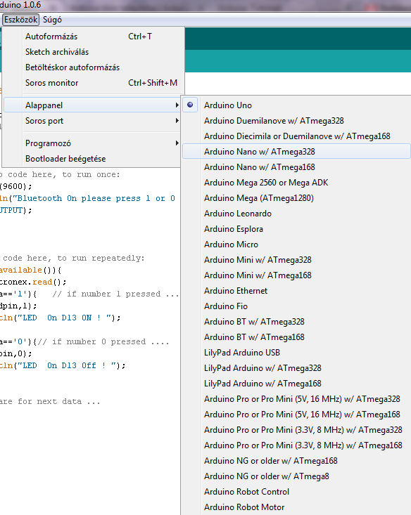 Erre azért van szükség, mert ha egyszerre több eszköz van a PC-re csatlakoztatva, akkor a feltöltésnél mindig ki kell választani melyik COM porton melyik eszközre akarjuk feltölteni a sketch-et. Itt jegyezném, meg hogy ha két különböző féle eszközt csatlakoztattunk például egy UNO-t és NANO-t, akkor miután beállítottuk a COM portot, nem árt átállítani az eszköz típusát sem.