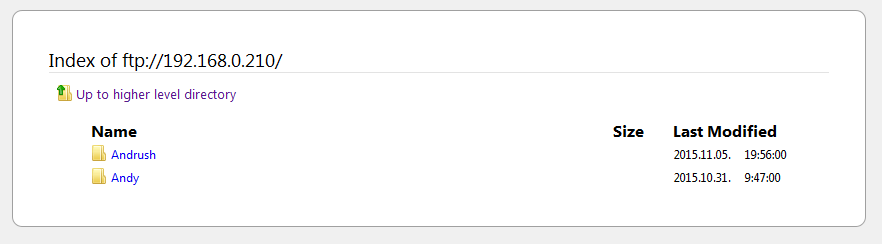 Abban az esetben ha a Total Commander nincs a gépünkön, akkor a böngészőnk címsorába beírjuk a vas ip címét a következő formátumban: „ftp://192.168.0.210/”. Megadjuk a felhasználónevünket és jelszavunkat és meg is jelenik a tartalom.
