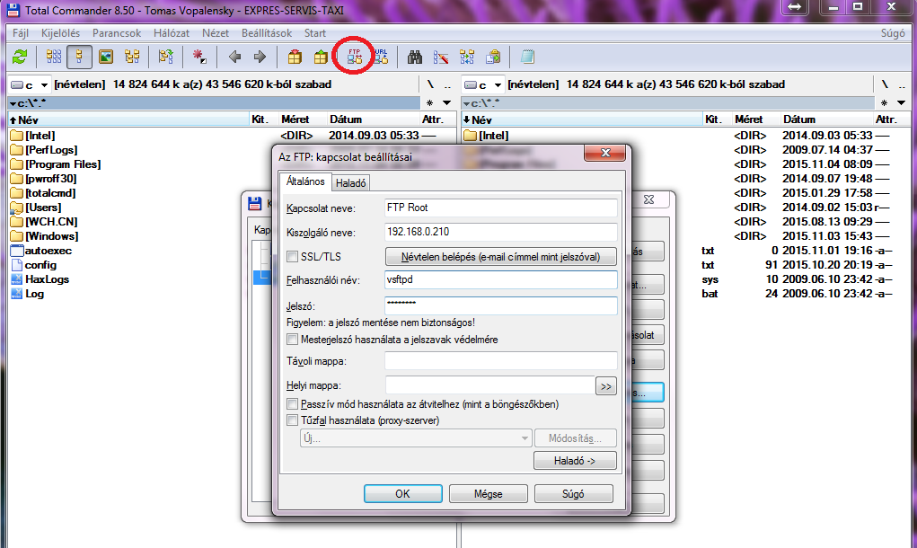 Ezután nincs más dolgunk mint letesztelni azt, hogy valóban elérjük-e az ftp szerverünket. Ehhez a legegyszerűbb és leggyorsabb windowsos ftp kliens benne van a „Total Commander”-ben.