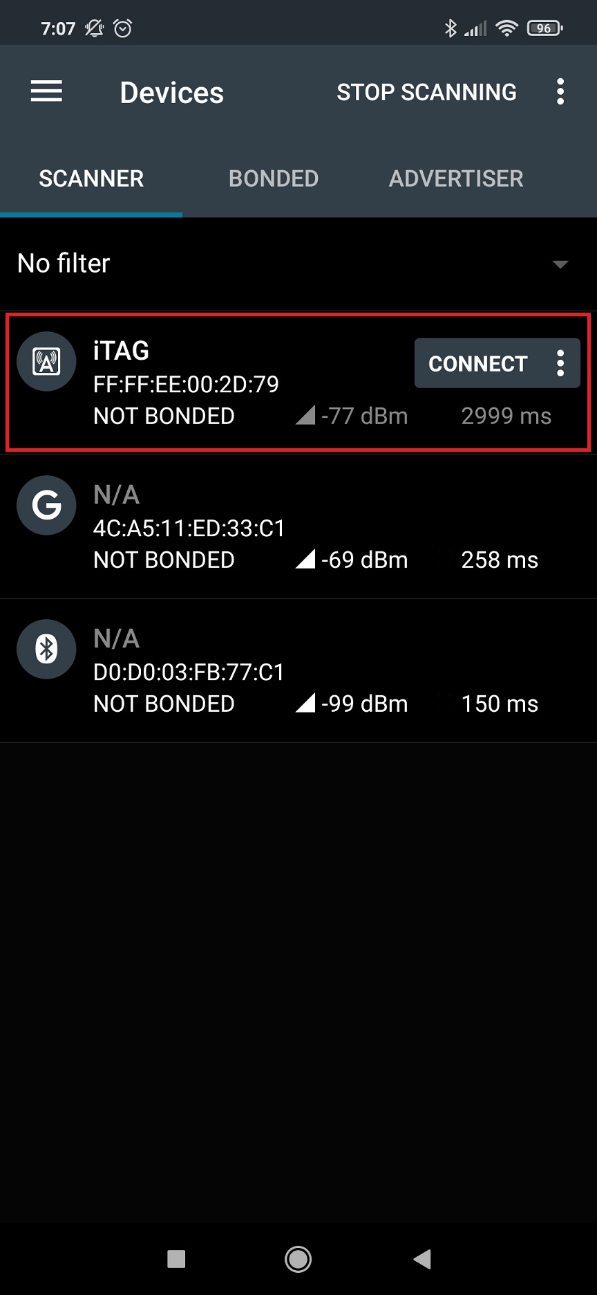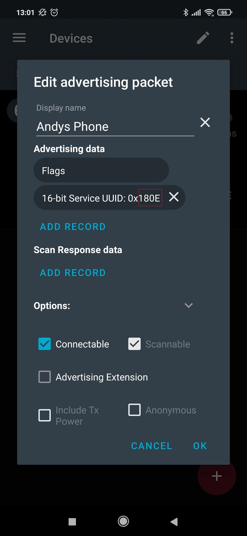 A kódból könnyen kiolvasható, hogy melyik két eszközre voltam kíváncsi. A Honor Band 4 BLE aktivitásmérőmre, és a telefonomra. Mint azt már írtam, sajnos a telefont csak hack-el lehet BLE eszközként érzékelni. A következő megoldást választottam: