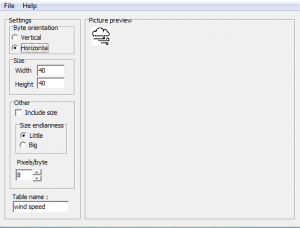 Ha megvagyunk a méretre és formátumra konvertálással a következő lépés a HEX-é alakítás. Erre az LCDassistant alkalmazást használtam. Az alkalmazás megnyitása után válasszuk a File menüpont Load image opciót, majd válasszuk ki a konvertálni kívánt képet. Ezután a következő beállítási paraméterekkel konvertáljuk át a képet egy „something”.c fájlra.